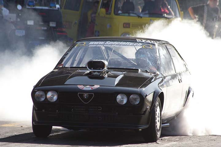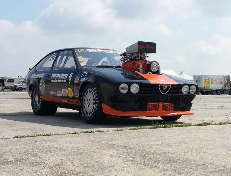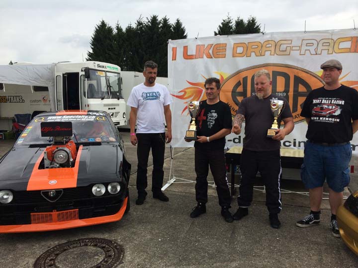 Alain Duerr & Jorg Schumacher had a very successful run at the Nitro Olympics in Hockenheim, Germany. They ended up R/U in the Outlaw Race with their might little blown B-1 B/A small block engine in an Alpha Romeo...against many other larger pro mod style combinations. They had to quickly rebuild the frond end from a previous top end accident at a track in Italy, the month before.